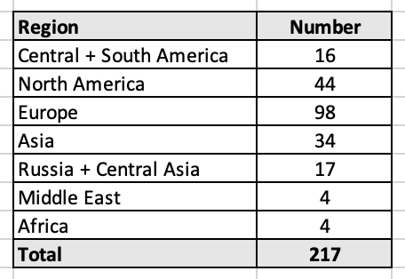 The Distribution. Of the 217 entries on this list, approx. 10% distributed globally remain uncertain. Those locations (n ≈ 17) originate from reports that provide country-scale tabulations, but for which the location of the sites can’t be corroborated from other sources (So: as example, one report may indicate that 3 mercury cell chlor-alkali facilities were built in Argentina, but review of other reports, conference proceedings and publications only confirm locations for 2 facilities). In these instances, the numbered placeholder is retained for the moment and counted on this list, while recognizing that the report from which the tabulated listing originated may have been in error.